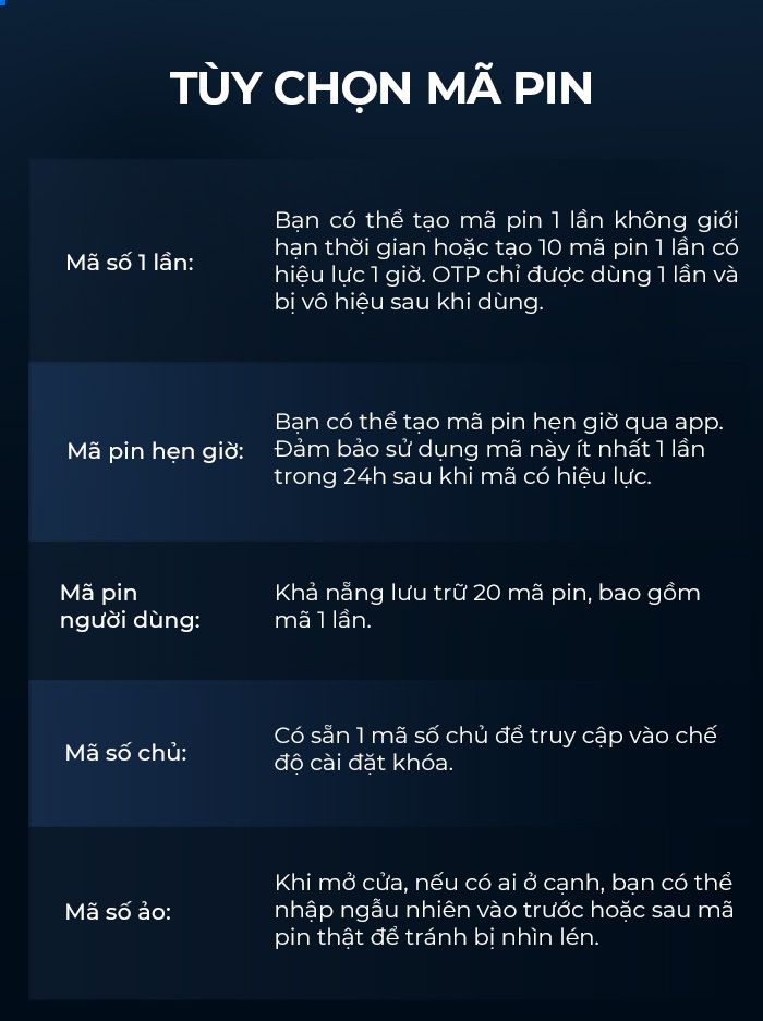 - Bảo mật kép: khi cần thì gia chủ cài đặt yêu cầu nhập 2 lớp mật khẩu mới có thể mở khóa, gấp đôi an ninh cho ngôi nhà.