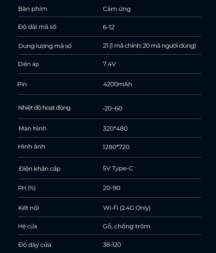 Dung lượng lưu trữ của khóa rất lớn: 50 khuôn mặt, 100 tĩnh mạch, 100 vân tay, 100 thẻ từ, 21 mã số (gồm 1 mã số chủ để quản lý cài đặt và 20 mã số người dùng). Bạn có thể linh hoạt tạo nhiều phương thức mở khóa khác nhau cho mọi thành viên trong gia đình.