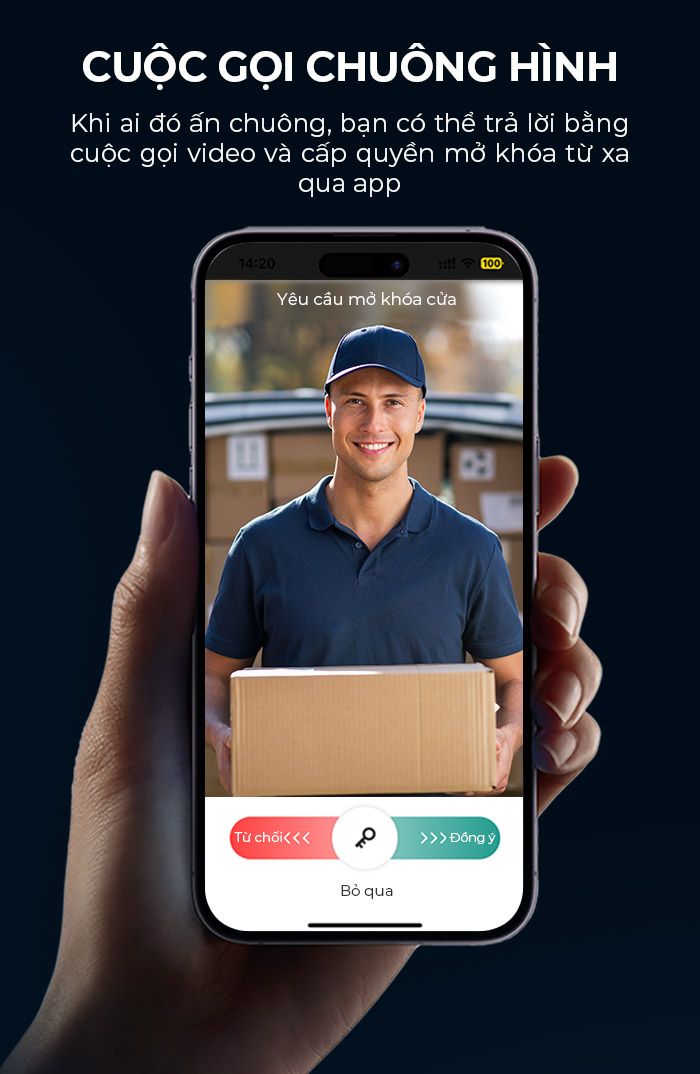 Ngay khi khách bấm chuông mà không có ai ở nhà ra mở cửa, Kaadas Q9-FVP sẽ đẩy cuộc gọi video đến điện thoại của gia chủ. Đàm thoại video trực tiếp với khách thông qua khóa và điện thoại bất chấp khoảng cách từ rất xa. Do đó, dù đi vắng nhưng bạn vẫn giống như đang ở nhà, có thể nói chuyện và quan sát mọi thứ xảy ra trước cánh cửa dễ dàng.